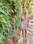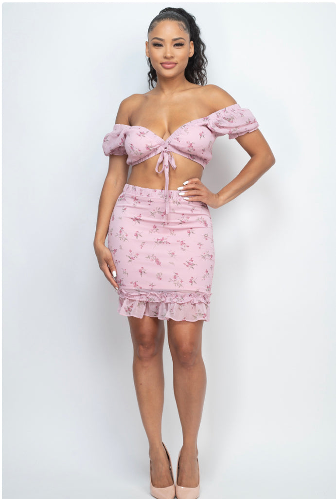 | Top: A woven tank top featuring an allover floral print detail, front self-tie, off-shoulder, short ruching sleeves, and a cropped hem. Bottom: A woven skirt featuring an allover smock and floral print detail, elasticized waistband, high waist, and a ruffled-trim hem. |